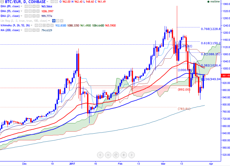 BTC/EUR is seen trading below in red on Tuesday and has shown a minor jump till 964 yesterday after making a low of 826 (Mar 25th, 2017 low) (COINBASE). It is currently trading around 971.86 at the time of writing.