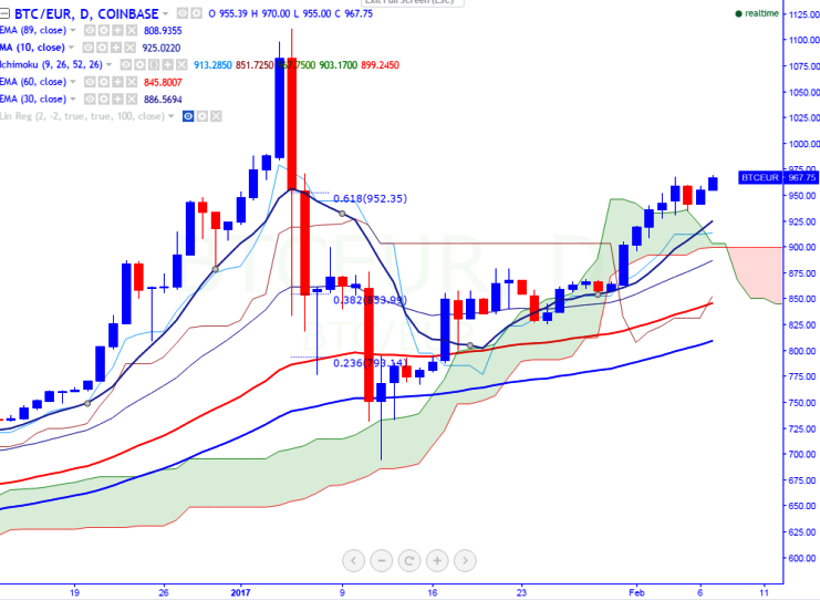 BTC/EUR is seen trading in a narrow range between 968.50 and 935 for the past three trading sessions (COINBASE). It is currently trading around 976.20 at the time of writing.