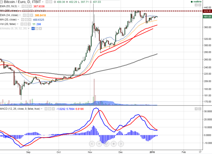 - BTC/EUR is consolidating in narrow range between 371 and 405. It is currently trading around 402.