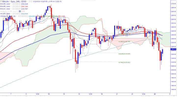 BTC/EUR recovered slightly after hitting a low of 2043 yesterday (CEXIO). The pair major support is around 2015 (Jun 15th low) and any bearish continuation can be seen below that level. It is currently trading around 2253 at the time of writing.