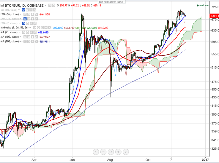 Long-term trend remains to be bullish. In the daily chart, BTC/EUR is facing strong support at 685 and any break below will drag the pair till 645 (55- day EMA).