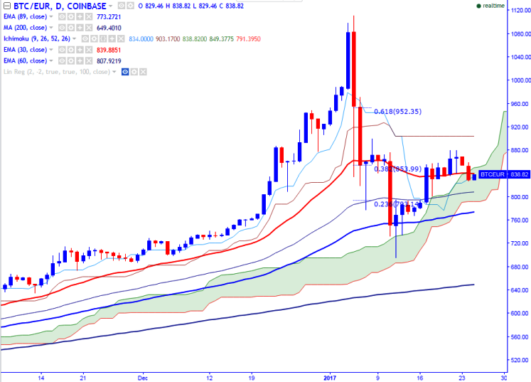 BTC/EUR is seen trading slightly above on Wednesday and the pair has declined slightly below daily Tenken-Sen and recovered from that level (COINBASE). It is currently trading around 839.01 at the time of writing.