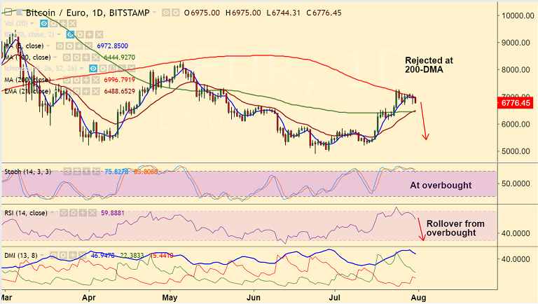 - BTC/EUR fails at 200-DMA, slips 2.78% lower on the day at 6779.