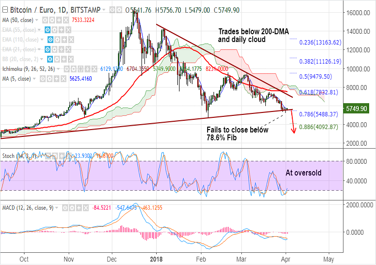 - BTC/EUR is extending range trade around major trendline support at 5575 levels.