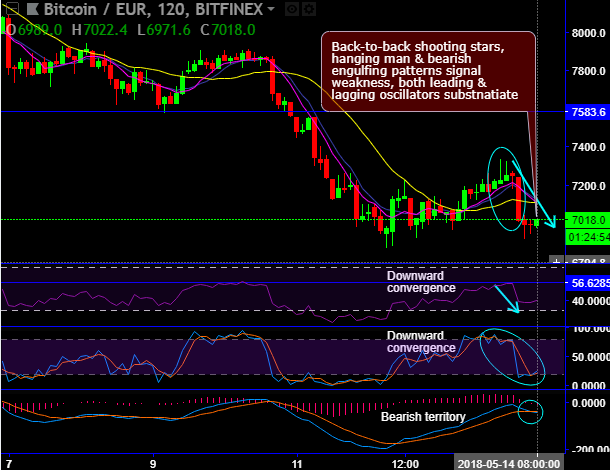 BTCEUR forms back-to-back shooting stars, hanging man and bearish engulfing patterns at 7224.5, 7249.5, 7252.3 and 7016.5 respectively that signal weakness, both leading and lagging oscillators substantiate these bearish sentiments (refer 2H chart).