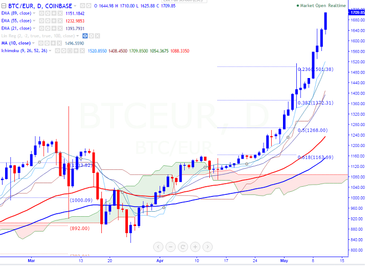 BTC/EUR hits once again all-time high at 1710 after breaking the high of 1649.97 made yesterday. The pair has formed a minor bottom at 1343 (May 4th low) and nay minor weakness can be seen only below that level (COINBASE). It is currently trading around 1725.31 at press time.