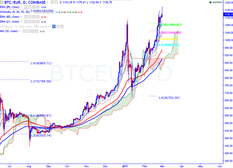 BTC/EUR has broken high made on 24th Feb 2017 and hits fresh all-time high around 1180 levels (COINBASE). It is currently trading around 1136 at the time of writing. The overall trend is extremely bullish and any minor weakness can be seen only below 1038 (21- day EMA).