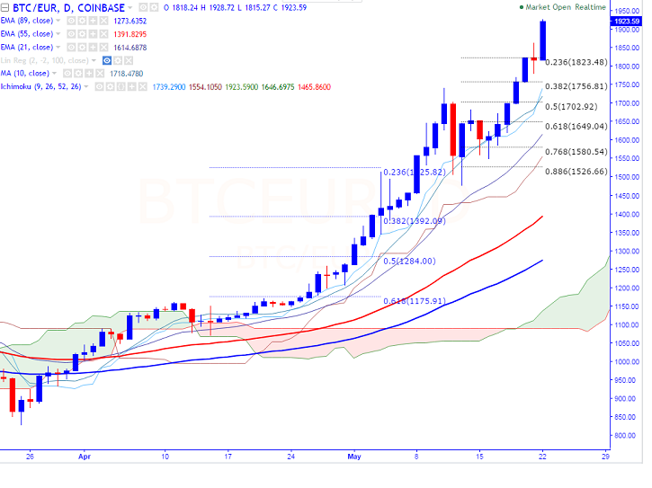 BTC/EUR has broken the major resistance of 1742 all- time high made on May 11th 2017 and jumped till 1928 levels (COINBASE). The pair has formed a minor bottom around 1476 on May 13th 2017 and any minor weakness can be seen only below that level. The pair is currently trading at 1951.64 at the time of writing.