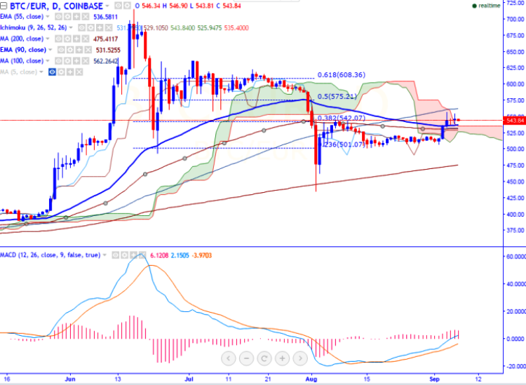 BTC/EUR is seen struggling to move above on Wednesday. The pair has slightly retreated from the high of 554.82 made yesterday (COINBASE). It is currently trading around 545.13 at the time writing.
