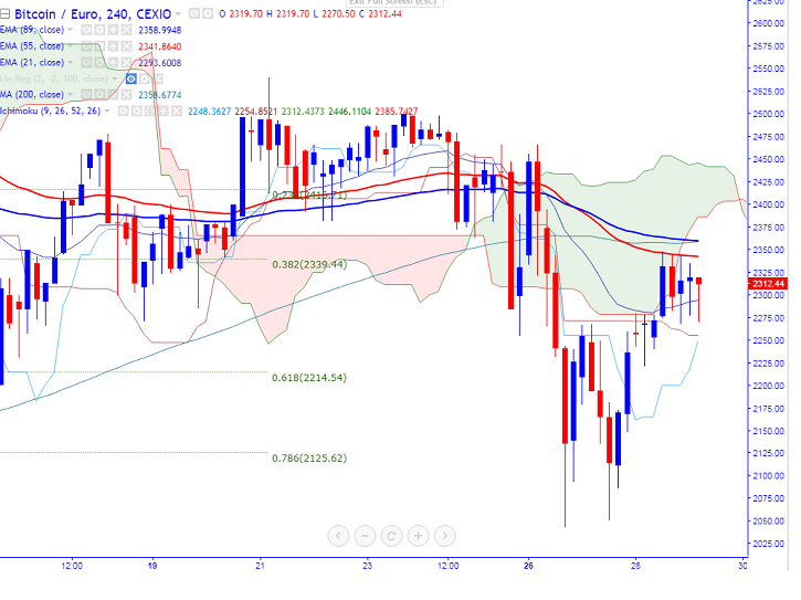 BTC/EUR has recovered till 2347 yesterday after making a low of 2051 on 27th Jun 2017 (CEXIO). The pair major support is around 2015 (Jun 15th low) and any bearish continuation can be seen below that level. It is currently trading around 2282 at the time of writing.