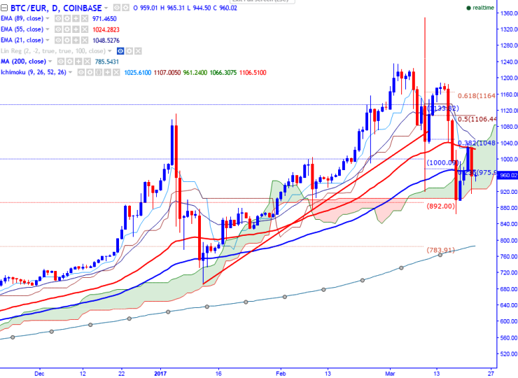 Minor resistance is around 1030 (55- day EMA) and any break above will take the pair to next level till 1057 (21- day EMA)/ 1107 (daily Kijun-Sen). Short term support is seen at 970 (89 day EMA) and any break below will drag the pair till 920 (Mar 10th 2017).