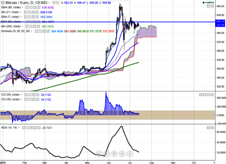 Long-term trend remains to be bullish. BTC/EUR trades slightly above daily Tenkan-Sen and Kijun-Sen. So a slight jump till 613/630 is possible.