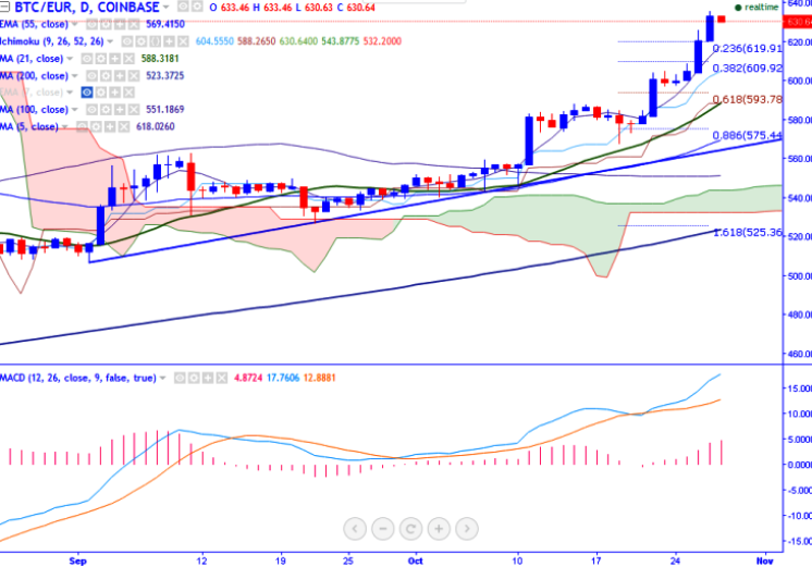 BTC/EUR is seen trading slightly below in red on Friday. The pair slightly retreated till 622 after jumping till 630.64 levels (COINBASE). It is currently trading around 630.66 at the time of writing.