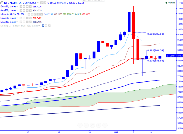 BTC/EUR is trading in a narrow range on Wednesday between 900 and 840 for the past three trading session (COINBASE). It is currently trading around 874 at the time of writing.