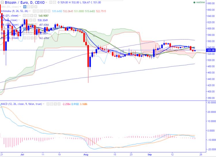 BTC/EUR is seen trading below in red on Friday. The pair has slightly recovered from the low of 525 made yesterday (CEXIO). It is currently trading around 529.35 at the time of writing.