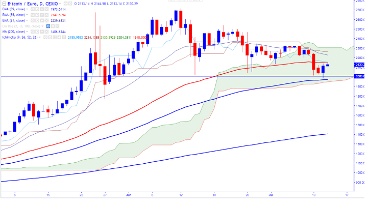 BTC/EUR has recovered slighty after hitting low of 1987 Jul 12th 2017 (CEXIO). The pair shown a minor recovery till 2145 at the time of writing and is currently trading around 2144 at press time.