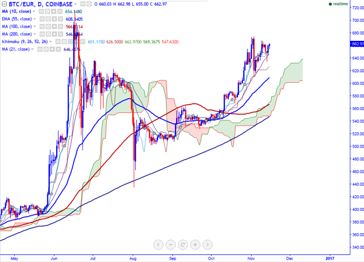 BTC/EUR is seen trading slightly above on Tuesday. The pair recovered slightly after declining till 634.50 on 13th Nov 2016 (COINBASE). It is currently trading around 662.96 at the time of writing.