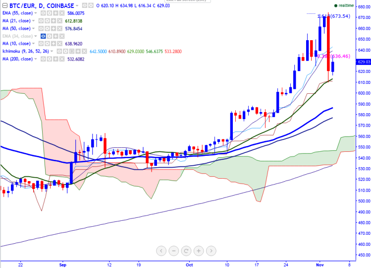 BTC/EUR is seen trading above on Friday. The pair declined sharply after making a temporary top at 673.25 levels (COINBASE). It is currently trading around 636.92 at the time of writing.