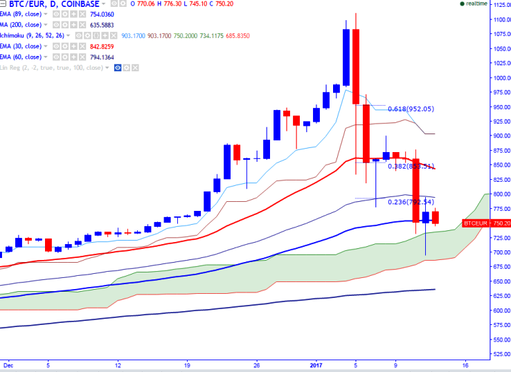 BTC/EUR has shown a slight jump till 795 after declining till 694 yesterday (COINBASE). It is currently trading around 747.81 at the time of writing.