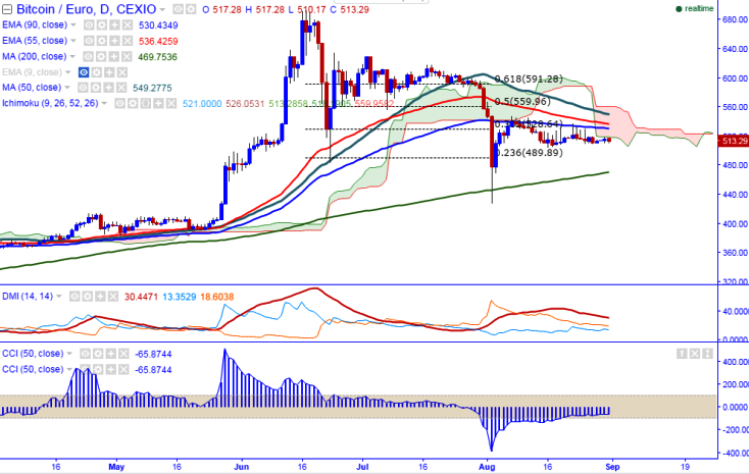 Long-term trend remains to be bullish. In the daily chart, BTC/EUR is facing strong support at 500 and further weakness only below 500.
