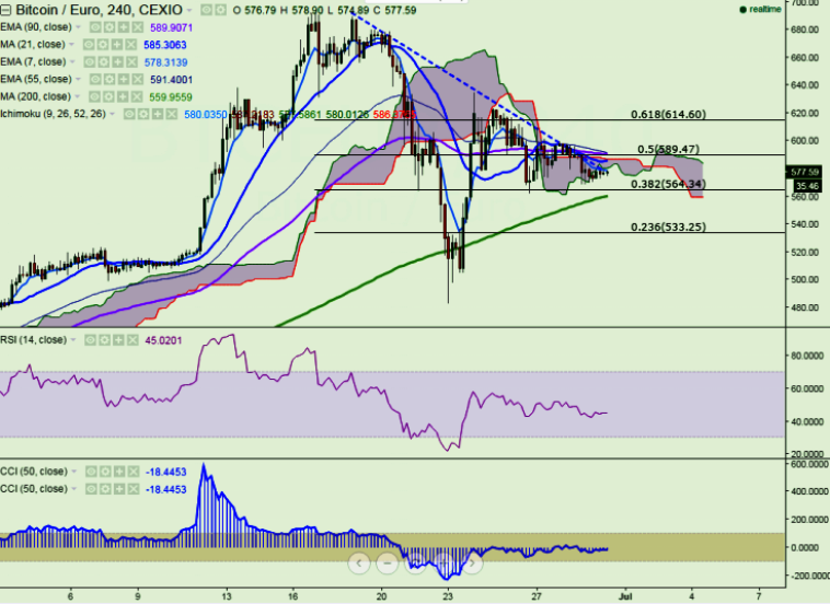 BTC/EUR is seen trading in red on Thursday. The pair is trading in narrow range between 635 and 562 levels (CEXIO) for the past four trading session. It is currently trading at 578.03 at the time of writing.