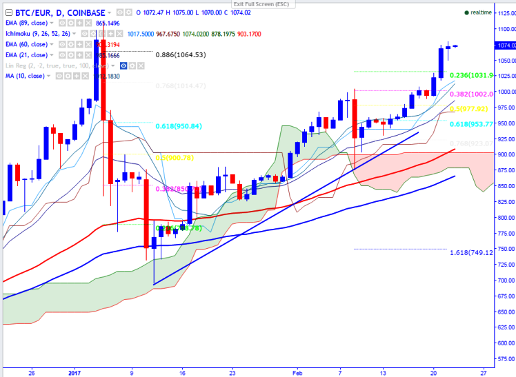 BTC/EUR continuing its winning streak for the past twelve trading sessions and has made a high of 1080.50 yesterday. It is currently trading around 1085 at the time of writing. Short term trend of the pair is extremely bullish as long as support 875 (Feb 9th low). It is also trading well above short-term EMA (21 and 60 days EMA) and also above long term EMA (89 and 200 days EMA).