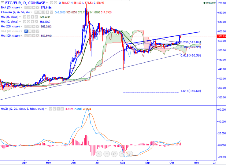 BTC/EUR is seen trading slightly below on Wednesday. The pair has broken major resistance 563 and jumped till 583.13 yesterday (COINBASE). It is currently trading around 579.24 at the time of writing.