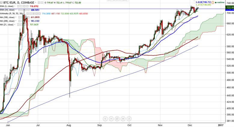 BTC/EUR is seen trading well above on Friday. The pair has closed well above psychological resistance of 700 yesterday (COINBASE). It has jumped till 724 and currently trading around 722.18 at the time of writing.