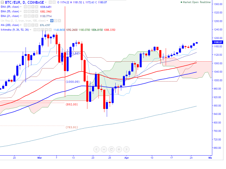 BTC/EUR has broken minor resistance at 1172 high made on Apr 21st 2017 high and jumped till 1181.52 (COINBASE). It is currently trading around 1180.17 at the time of writing.