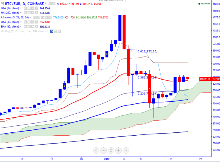 BTC/EUR is trading in a narrow range between 857.92 and 788 for the past three trading sessions (COINBASE). It is currently trading around 842.32 at the time of writing.