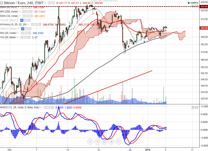 - BTC/EUR is consolidating in narrow range between 371 and 402. It is currently trading around 399.85.