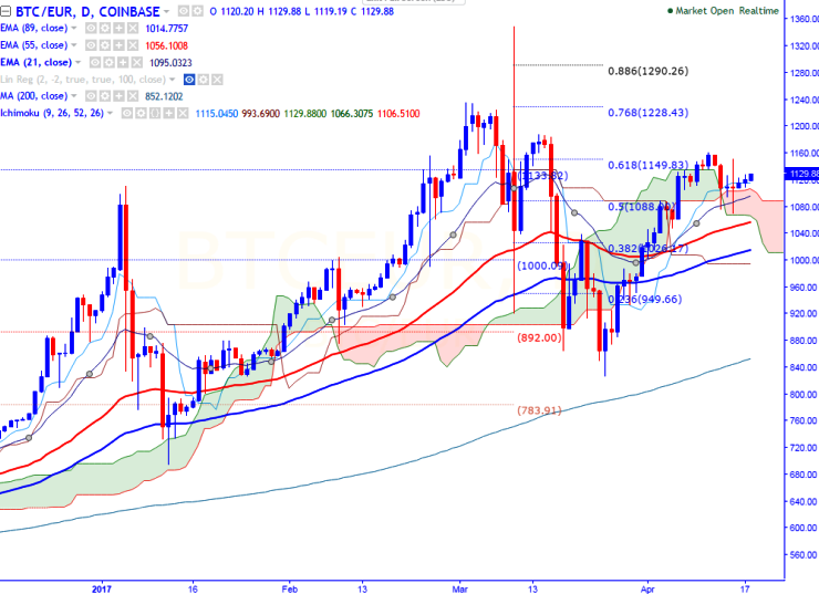The long-term trend remains to be bullish. BTC/EUR faces strong resistance at 1188 (Mar 14th, 2017 high) and any break above confirms minor bullishness.