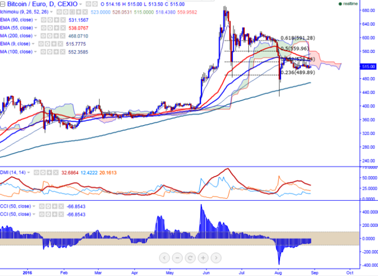 BTC/EUR is seen trading slightly above on Monday. The pair is trading in a narrow range between 537 and 509 for the past six trading session (CEXIO). It is currently trading around 515.57 at the time of writing.