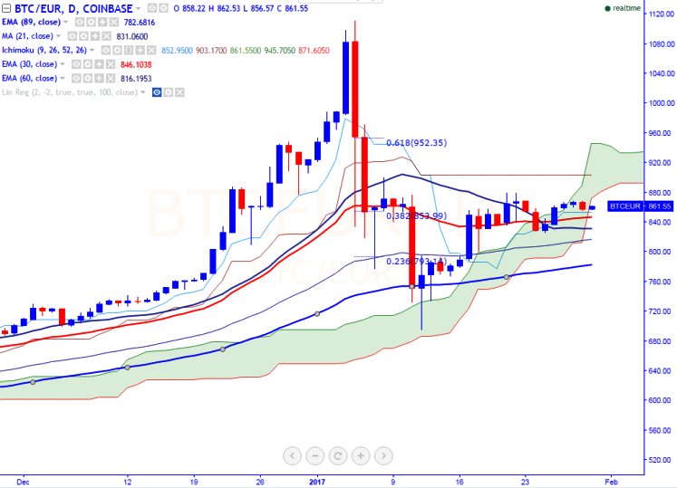 BTC/EUR is seen trading in a narrow range between 825.90 and 869 for the past five trading days (COINBASE). It is currently trading around 861.13 at the time of writing.