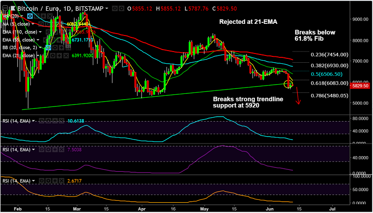 - BTC/EUR consolidates break below major trendline support at 5920, bias lower.