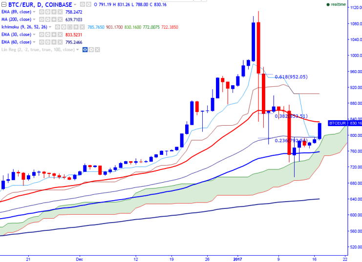 Long-term trend remains to be bullish. In the daily chart, BTC/EUR trades slightly above 60- day EMA and a jump till 900 is possible.