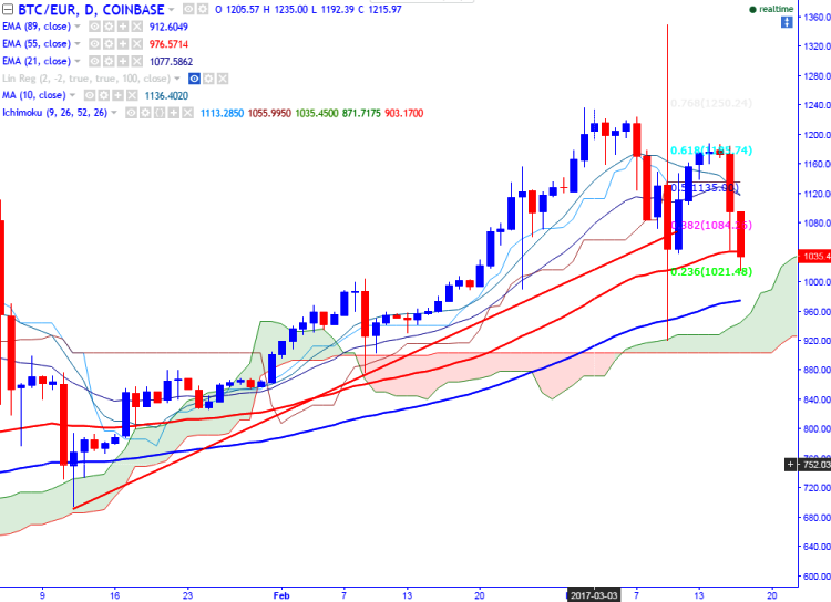 BTC/EUR broken major support at 1093 and declined till 1042 yesterday (COINBASE). The pair has closed around 1096. The pair is currently trading around 1035 at press time.