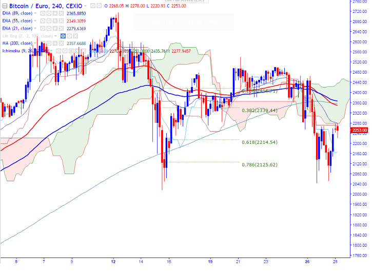 BTC/EUR has once again recovered after making a low of 2051 yesterday (CEXIO). The pair major support is around 2015 (Jun 15th low) and any bbearish continuation can be seen below that level. It is currently trading around 2253 at the time of writing.