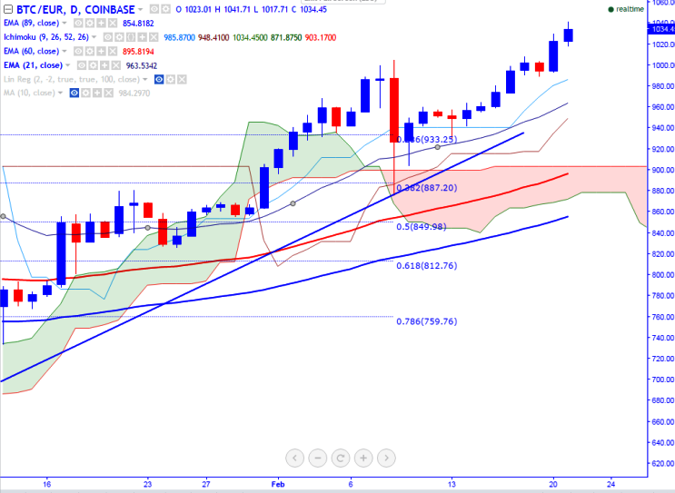 BTC/EUR is seen trading above on Tuesday and the pair breaks a major resistance at 1005 high made on Feb 9th yesterday and closed well above that level (COINBASE). It is currently trading around 1033.56 at the time of writing.