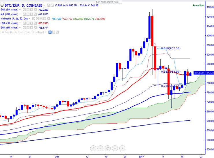 BTC/EUR is seen trading slightly above on Thursday. The pair has made a high of 857 and slightly declined from that level (COINBASE). It is currently trading around 844 at the time of writing.