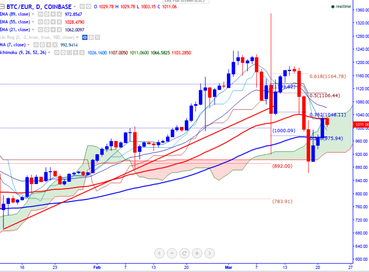 BTC/EUR has shown a minor decline till 1003 at the time of writing after a jump till 1038 (COINBASE). It is currently trading around 1009.01 at press time.