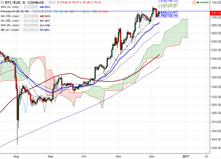 BTC/EUR is seen trading low on Thursday. The pair is trading slightly above psychological resistance of 700 levels (COINBASE). It has jumped till 718 and currently trading around 712.33 at the time of writing.