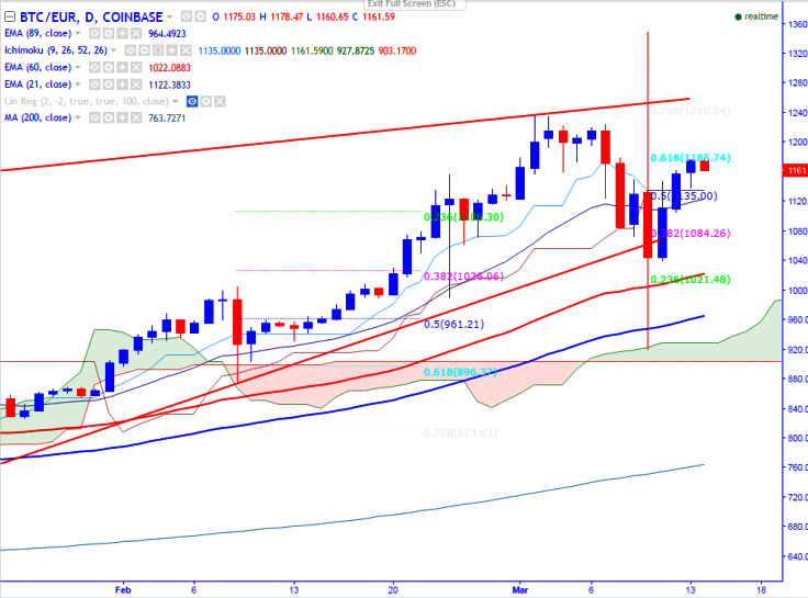 BTC/EUR has recovered sharply from the low of 920 made on Mar 10th 2017 after US SEC Bitcoin ETF rejection. The pair jumped almost 250 from the low (COINBASE). It is currently trading around 1160 at press time.