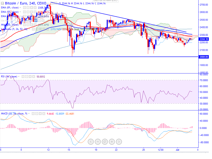 BTC/EUR has declining after hitting a minor top around 2333 on Jun 30th 2017 (CEXIO). The pair major top is around 2715 (Jun 12th high) and any bullish continuation can be seen below that level. It is currently trading around 2233.20 at press time.
