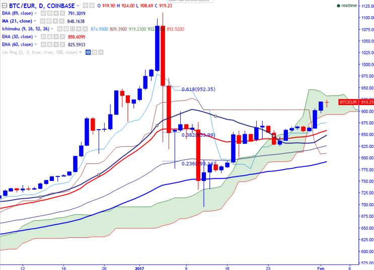 BTC/EUR is seen trading high on Thursday. The pair has broken the major resistance of 903 yesterday after long consolidation between 694 and 880 for the past one month (COINBASE). It is currently trading around 919.23 at the time of writing.