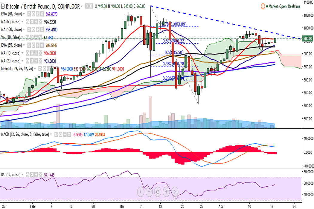 BTC/GBP broke above 10-DMA on Tuesday and is currently trading at 960 levels at press time (Coinfloor).