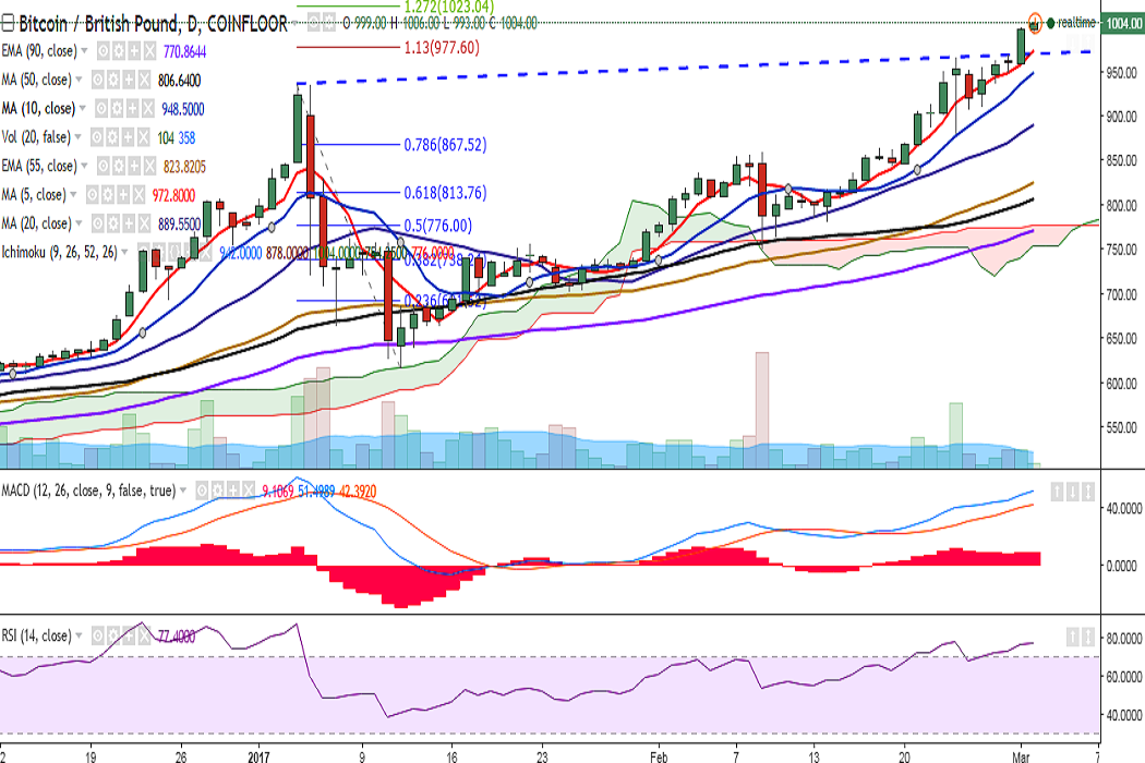 BTC/GBP continued its uptrend on Thursday, surging past the 1000 mark. It is currently hovering around its new all-time high of 1006 levels at the time of writing (Coinfloor).