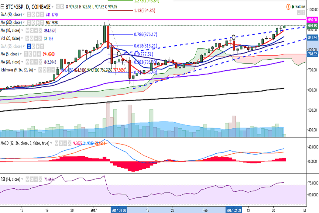 BTC/GBP is trading higher on Thursday around 920 levels at the time of writing (Coinbase).