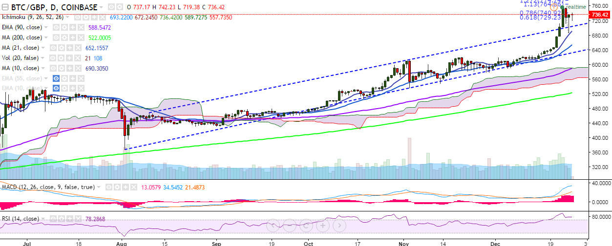 BTC/GBP declined to 686.22 levels after hitting a high of 755.81 levels on December 24. It has restored its strength to above 700 levels and is currently trading at 734 levels at the time of writing (Coinbase).