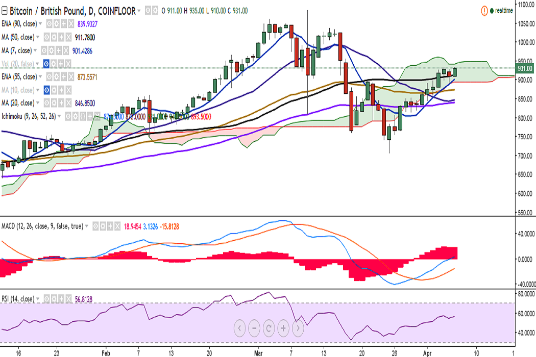 BTC/GBP is currently holding well above 50-DMA and trading at 931 levels at the time of writing (Coinfloor).